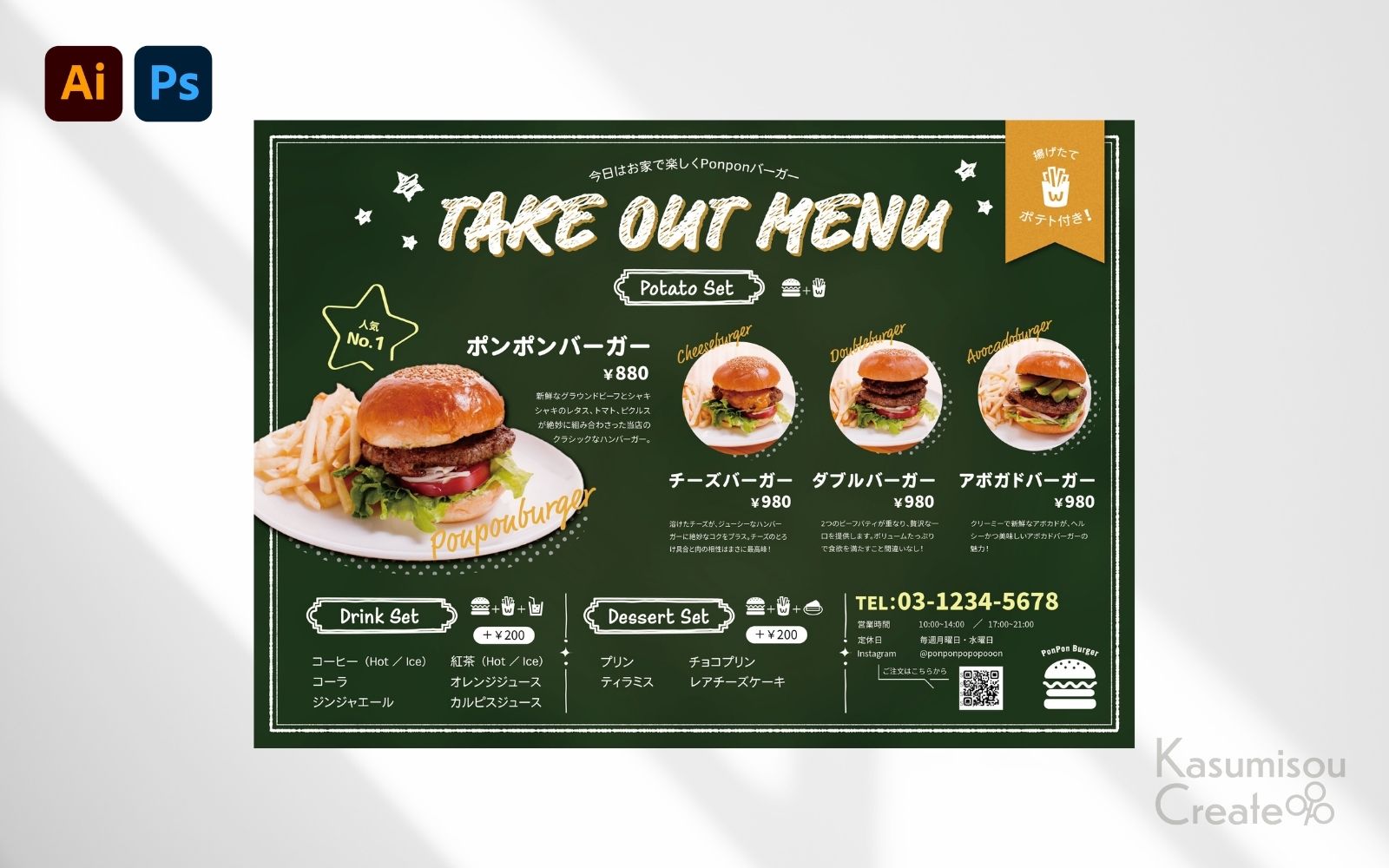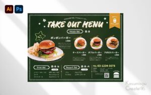 ハンバーガーショップのテイクアウト用メニューチラシ