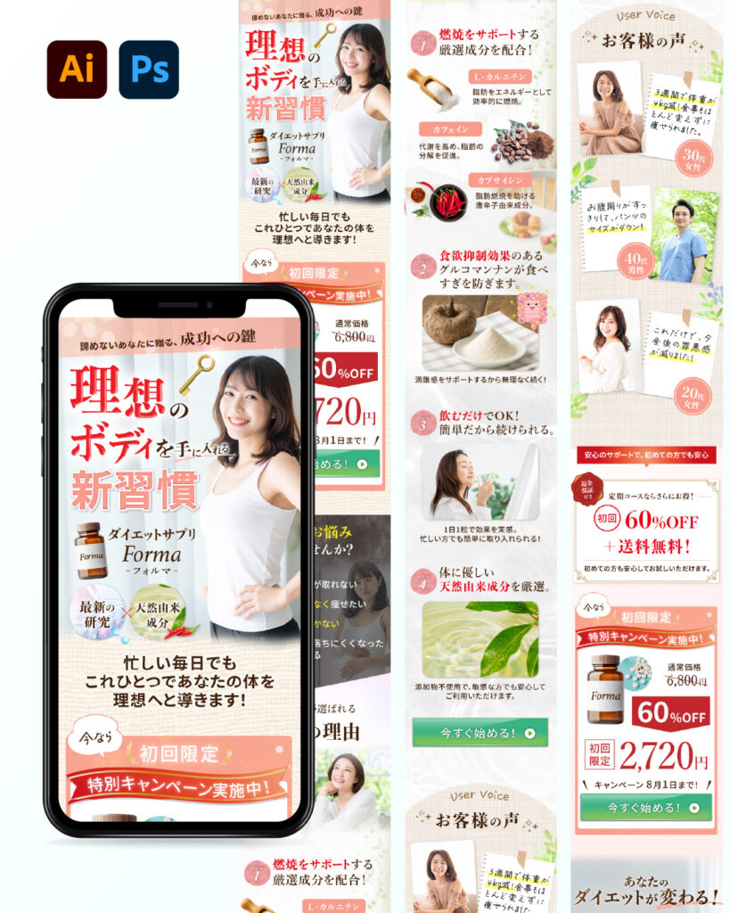 - 過度に“痩せ”を強調せず、「毎日の生活にそっと寄り添うサプリ」という世界観を軸に、安心感と続けやすさを感じてもらえるLPを目指しています。